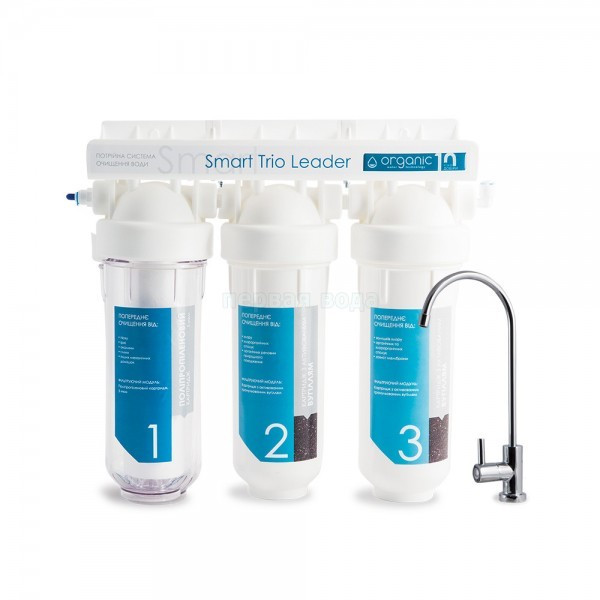 Фильтр проточного типа Organic Smart Trio Leader — украинская система, проводящая очистку воды в реальном времени, без перенаправления ее в накопительный бак. Высокое качество очистки и невысокая цена фильтра сделали его востребованным. Уникальность данной системы состоит в том, что ее можно в любой момент времени, по желанию пользователя, существенно улучить и превратить в фильтр обратного осмоса с шестью или восемью этапами очистки. Достаточно лишь установить необходимые картриджи.