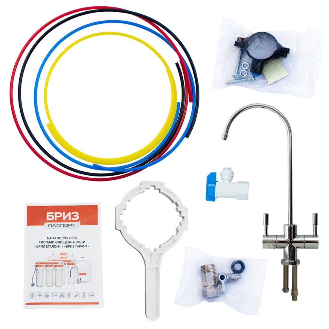 Установочный комплект включает все необходимые материалы для быстрого подключения системы к водопроводу, канализации и удобства последующей эксплуатации:
