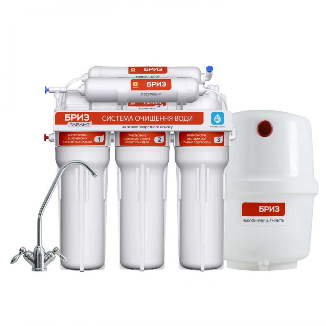 Система очистки воды «Бриз Гарант М Стандарт» состоит из шести последовательно соединенных колб, накопительной емкости для чистой воды и обеспечивает шестиступенчатую очистку воды на молекулярном уровне. Используется для многоступенчатой доочистки и кондиционирования воды в бытовых условиях, в объёме, необходимом для приготовления пищи и питья. Высокоэффективно очищает воду от механических примесей, хлора и его соединений, устраняет мутность, снижает содержание в воде органики, пестицидов, тяжелых металлов, трихлорметана и других вредных веществ. Обеспечивает степень очистки воды до 99,9 %; гарантирует качество питьевой воды без неприятных запахов, осадка и примесей. Комплектуется набором картриджей «Бриз Гарант №1 Стандарт», обратноосмотической мембраной, постфильтром, минерализатором, которые обеспечивают шестиступенчатую очистку воды: