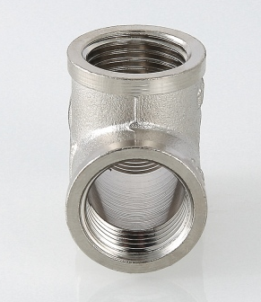 Латунный никелированный трехсторонний фитинг с переходом на меньший диаметр в центральном выходе. Резьба – внутренняя, цилиндрическая трубная по ГОСТу 6357 (ISO 228, EN 10226), совместима также с наружной конической трубной резьбой по ГОСТу 6211 (ISO R7).