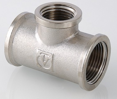 Латунный никелированный трехсторонний фитинг с переходом на меньший диаметр в центральном выходе. Резьба – внутренняя, цилиндрическая трубная по ГОСТу 6357 (ISO 228, EN 10226), совместима также с наружной конической трубной резьбой по ГОСТу 6211 (ISO R7).