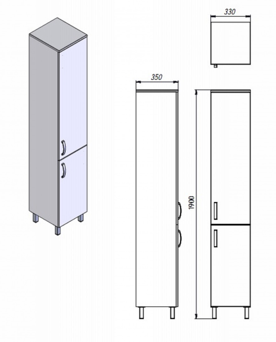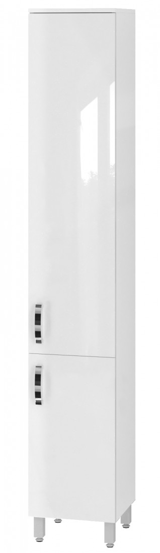 Пенал имеет два отделения, внутреннее пространство верхнего разделено двумя полками, которые изготовлены из ДСП белого цвета толщиной 16 мм. Нижнее отделение имеет корзину для белья.