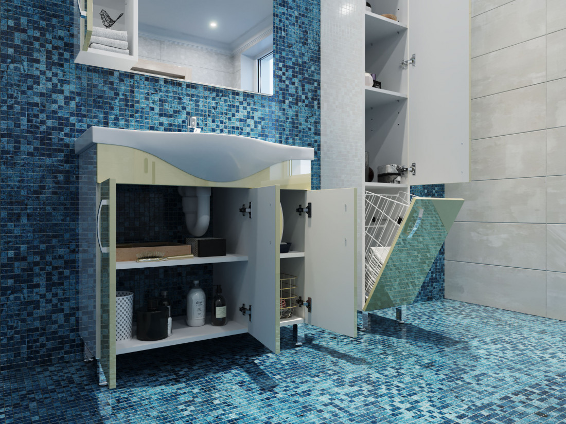 Корпус изготовлен из ламинированного ДСП толщиной 16 мм, а фасадные части из МДФ одностороннего ламинирования толщиной 16 мм и покрыты высокоглянцевой ПВХ-пленкой.