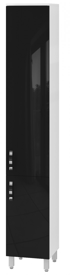 Пенал имеет два отделения, внутреннее пространство верхнего разделено двумя полками, которые изготовлены из ДСП белого цвета толщиной 16 мм. Нижнее отделение имеет корзину для белья.