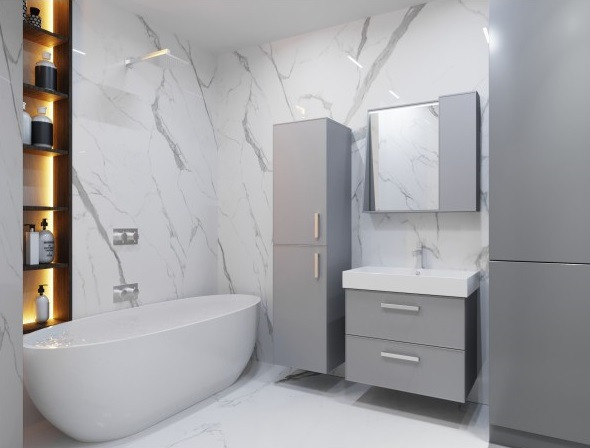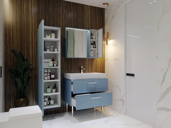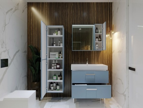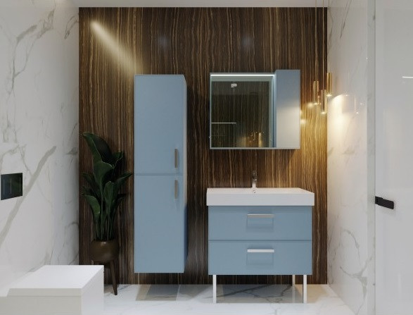 Мебель подвесная, встроены регулируемые навесы HAFELE. Также при желании пенал может дополнительно устанавливаться на ножки.