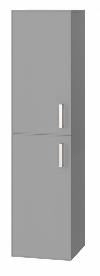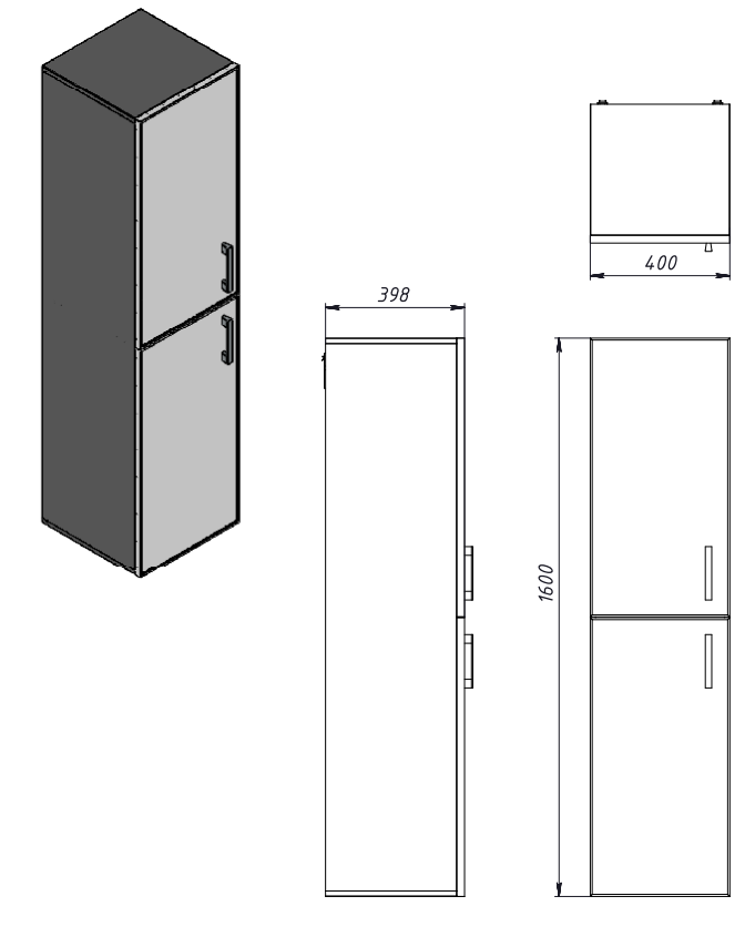 Шкаф-пенал имеет два отделения, внутреннее пространство каждого разделено двумя полками из ДСП. Дверцы навешены на петли с доводчиками, которые обеспечивают плавное и мягкое закрывание. Ручки из шлифованной стали.