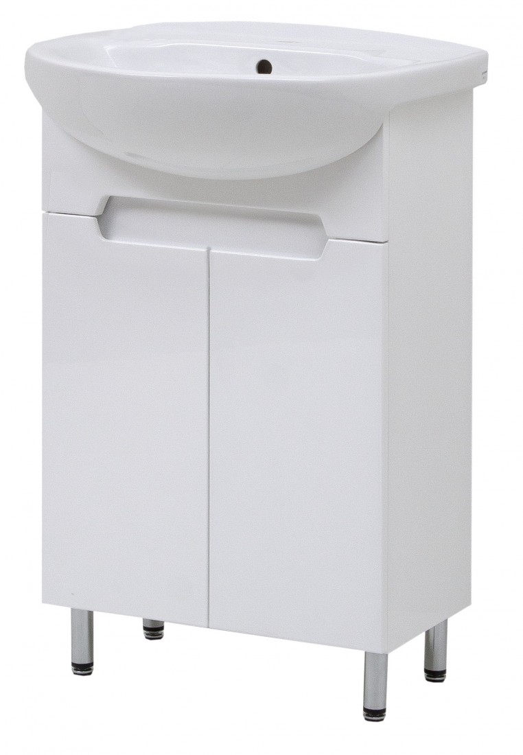 Тумба с умывальником ТМ «Марко» с отверстием и переливом, ножки. Тумба оснащена 2 полками. Корпус выполенен из ДСП с двухсторонней ламинацией белого цвета, толщина 16 мм. Фасад из МДФ с двухсторонней ламинацией, толщина 16 мм, окрашены эмалью с высокой степенью блеска.
