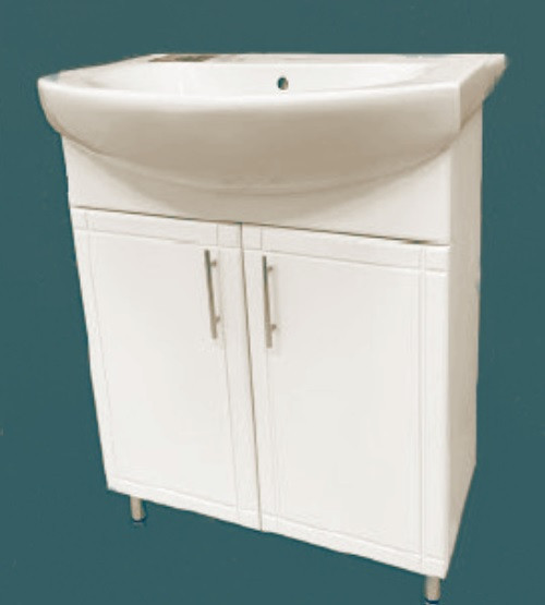 Комплект: Тумба, умывальник ТМ «Коломбо» с отверстием и переливом, ножки. Тумба оснащена 2 полками. Корпус выполнен из ДСП с двухсторонней ламинацией белого цвета, толщина 16 мм. Фасад декорирован и выполнен из MDF с двухсторонней ламинацией, толщина 16 мм. Фасады и внешние поверхности окрашены эмалью с высокой степенью блеска.