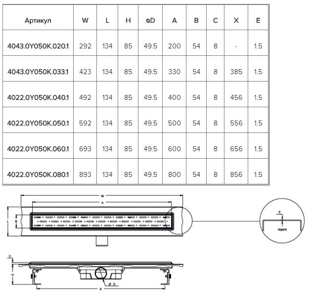 Решетка из нержавеющей стали имеет стильный внешний вид и высокое качество благодаря стали марки AISI 304. Двойной комбинированный гидрозатвор предотвращает попадание запаха из канализации в помещение при высыхании воды в сифоне.