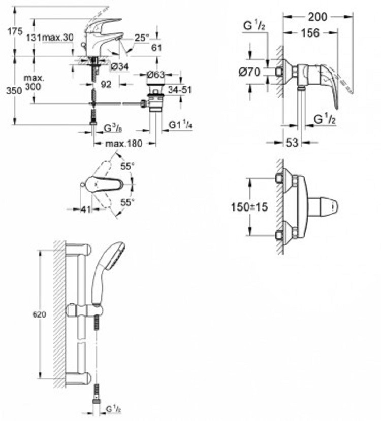 Смеситель для раковины с донным клапаном Grohe Euroeco (23262000); смеситель для душа Grohe Euroeco (32740000); Душевой набор Grohe New Tempesta (27853000)