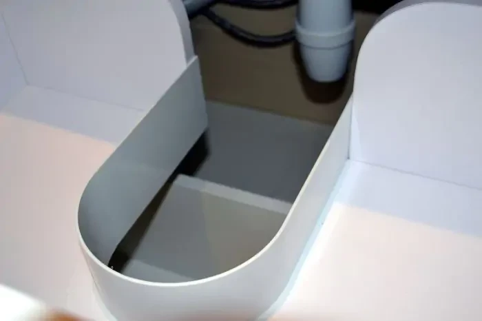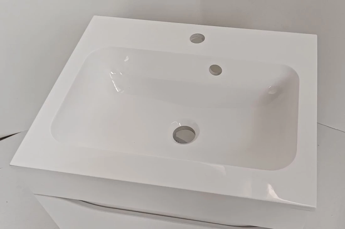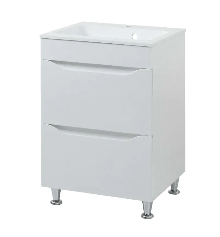Тумба Пектораль 55 під умивальник Frate 55 підлогова, оснащена двома шухлядами. Корпус виконаний із ДСП у білому кольорі, має додаткове лакове глянсове покриття, фасад складається з двох білих лицьових панелей які виконані з МДФ і пофарбовані високоякісною вологостійкою емаллю з високим ступенем блиску.