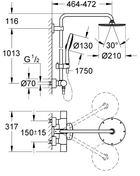 Ручной душ Ø 130 мм с четырьмя типами струи Grohe Power& Soul Cosmopolitan (27663000) верхний душ Ø 210 мм с одним типом струи Grohe Rainshower Cosmopolitan (28368000) душевой шланг 1750 мм Grohe Silverflex (28388000) держатель ручного душа настенный термостат душевой кронштейн 450 мм набор для крепления Инструкция по монтажу